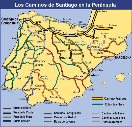 Today, the token symbol for El Camino is a scallop shell, due to the destination city’s proximity to the sea and as an allusion to the web of footpaths fanning from Santiago de Compostela. Many modern pilgrims (peregrinos) carry or wear a scallop shell to show that they are on this pilgrimage, and images of shells are used throughout the route to guide pilgrims along the path. The many foot paths have been whittled down to a handful of most common routes, the most popular of which is the Camino Frances – the French Way – which begins in western France. This is the route I will hike with my camigas (amigas on the Camino), starting halfway along that trail, in Sahagun.