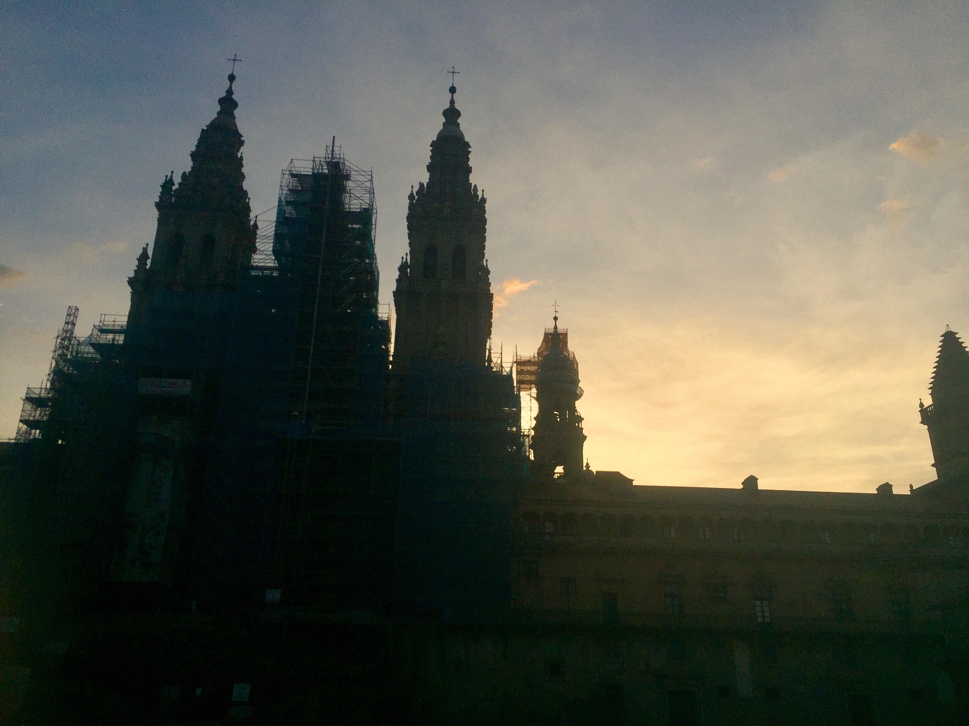We then headed to the plaza to await the sunrise behind the Cathedral. This, for me, was the Cathedral experience I was anticipating yesterday. The plaza was initially empty, save for a bus; then, a handful of biking pilgrims, then small groups of hikers. My very favorite was a solo hiker who limped circles around the giant plaza, videoing and grinning and unable to contain his joy. After waiting 2 hours and watching the sky slowly change hues, we finally gave up on seeing the sun peek over the 5-6 story church.