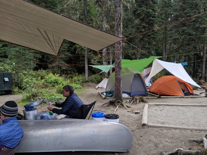 After lunch (I was ravenous, eating ΒΌ cucumber, 3 oz cheddar, 2 oz jerky, a Clif bar, 2 pieces of rye bread, an energy cookie, and a handful of M&Ms. Oops), we paddled another hour to our campsite on the shore of Isaac Lake – familiar, because this is night 2 of 3 on the shores of Isaac – setting up camp and a 300-foot web of overhead guylines to drape wet tent flies and tarps over us to protect against the next onslaught of rain. So far today has been windy and dry, but the weatherman says tomorrow won’t be; we’re thoroughly enjoying dry for now!!