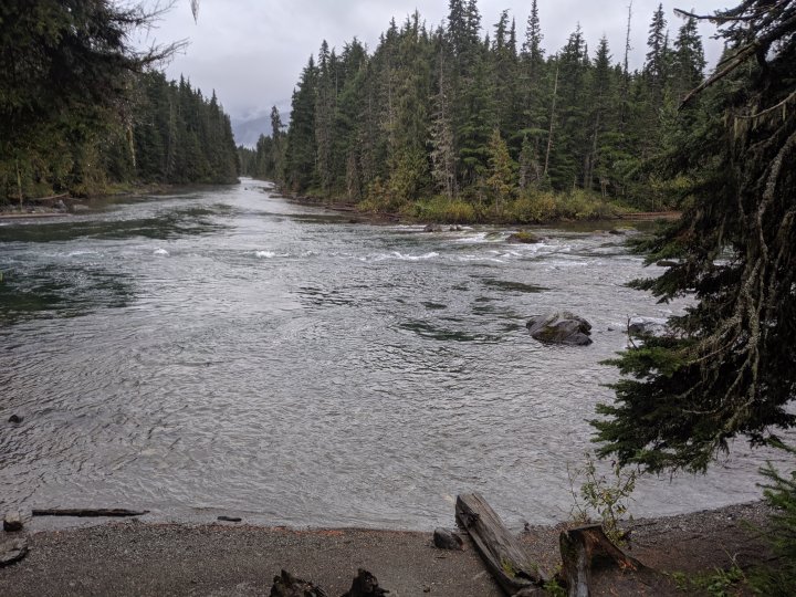 We met the Caribou with a rush, as the glacial silt-heavy water of the River churned rapidly in from the right, meeting the clear water of the lake outlet and swirling in muddy eddies until the water under our canoe was milky and opaque. We enjoyed a zigzag route down the quick river, a weather eye scanning the murky water for any hazards ahead. All five boats made it through the Caribou without episode, and we stopped for lunch on a sandbar to celebrate (and because we had a lull in the rain!).