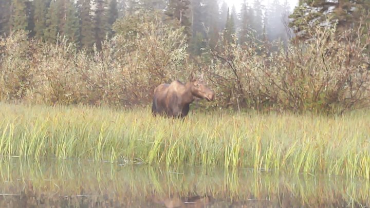 We were up at dawn, and on the water by 7:30; 2 hours earlier than our average start time. A fine mist hovered over the lake, undulating and opening to afford varying peeks at Kaza Mountain and the distant shore of the lake, casting an ethereal mood over the camp. Our canoes slid soundlessly through the sea of fog and water, the silence broken only by the dip of paddles and our gasps of delight at the early morning vistas. We navigated narrow grassy channels from Rum Lake to Unna Lake, up the river, and to Babcock Creek, where we were greeted first by a noisy flock of geese taking flight, then by a cow moose chomping reeds just feet away as we glided by (WOW).