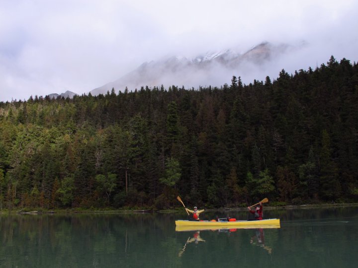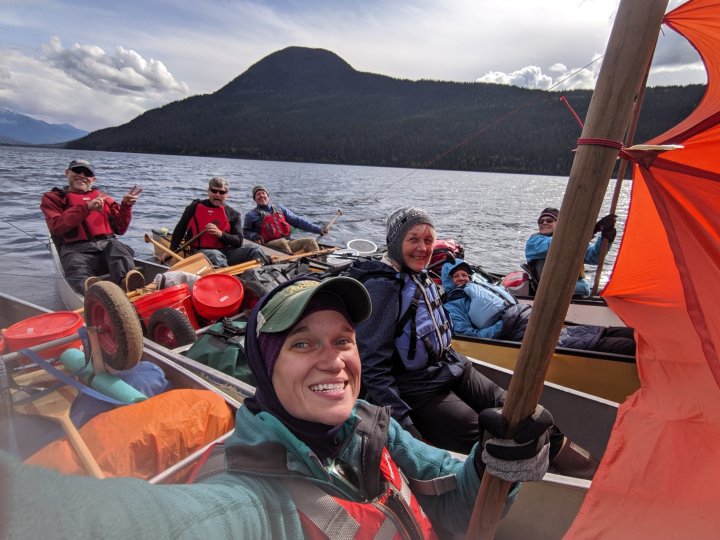 We moved into the Bowron River after lunch, enjoying a swift current that buoyed our progress through a veritable beaver habitat (we did have to travel through two dams under construction; sorry, little beaver friends). We soon broke out onto the open Bowron Lake, or last 8 km of the 30 km day. With a favorable wind at our backs, Ryan suggested we trial a sail down the lake. Lashing the canoes together using spare paddles, we raised a tent fly stretched between two dowels. I was one of the two pole anchors, bracing the butt of the dowel in the bow of the canoe and leaning precariously over the side of the canoe (every childhood canoe lesson was broken) to keep the makeshift sail taut. While it wasn’t a gale, we drifted along at a fair clip for 7 km! It was a real treat to float along together, chatting, singing, and smiling, while letting tired paddling muscles rest.