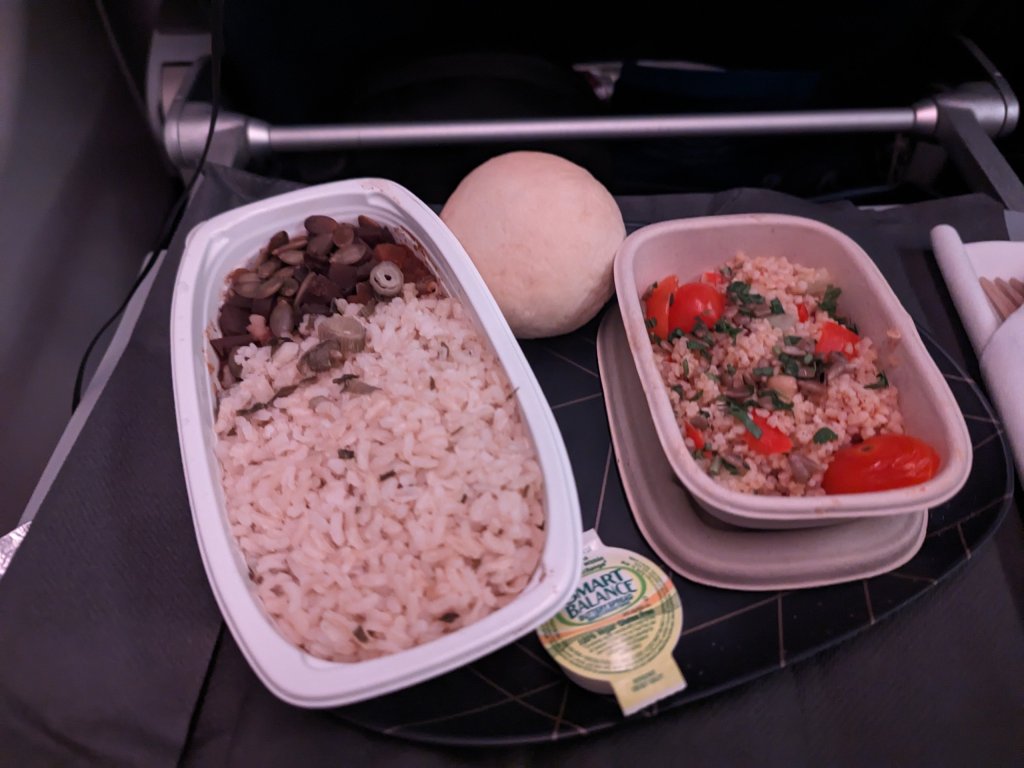 The absolute highlight of the trip so far has been the root vegetable chili and rice with couscous salad. The egg sandwich with mixed fruit was a close second. Good job, Delta Airlines!