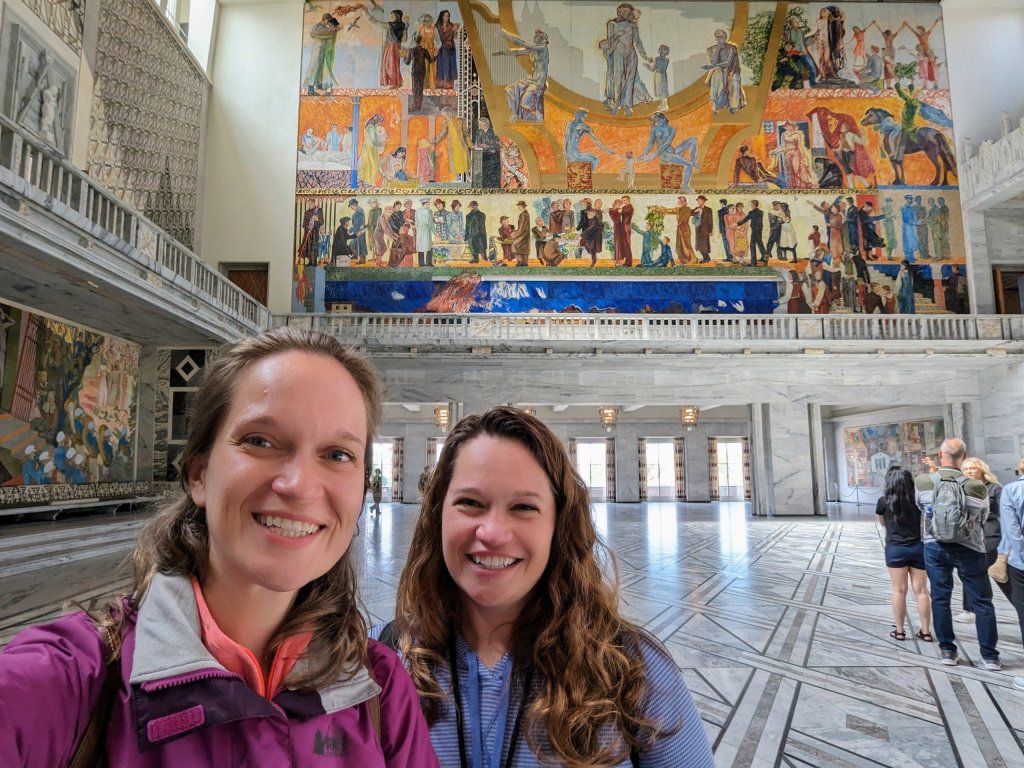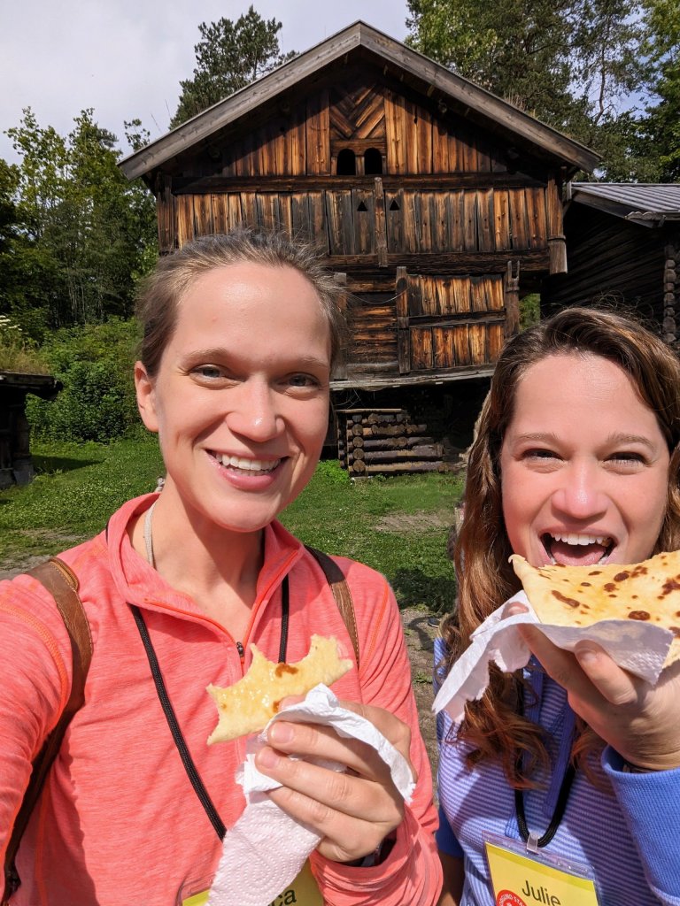 Thursday morning offered some blue sky views, a promising change from the forecast of rain all day long. We took a tour of Oslo City Hall and pretended we were laureates as we stood in the grand hall where the Nobel Peace Prize is awarded each December 10 at 1:00 pm. Then we were off to the Norsk Folkemuseum for a couple of hours of viewing traditional homes and barns, participating in live demonstrations of folk music and dance, and – the highlight for Jessica – enjoying lefse baked on an open hearth. 🤤