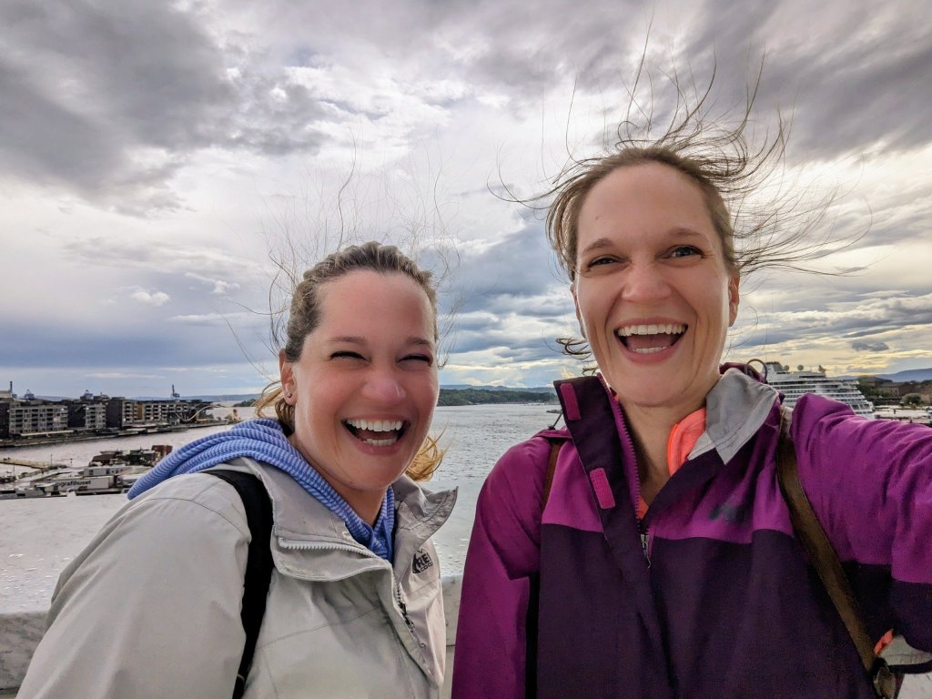 Thursday afternoon offered 5 hours of free time to explore Oslo. Our group of 33 fractured into pods of 1-4 persons and we set off on foot to see the sites. Julie and I walked down from the Royal Palace and gardens to tour the Historisk Museum and exhibitions of Viking lore (rune stones! swords!!) and samurai (armor! swords!!). Then we strolled along the Karl Johans Gate main pedestrian street and escaped a rain shower by ducking into a souvenir shop and using up the last of our Norwegian kronor currency. We waited for a break in the rain and traipsed down to the Oslo Opera House as the skies darkened and wind picked up. We climbed atop the Opera House for views of Oslo, and I got a fit of giggles as I looked at Julie, her hair standing on end. I was grateful to spot lightning rods above us as I realized that more than wind was shaping Julie’s hairdo.