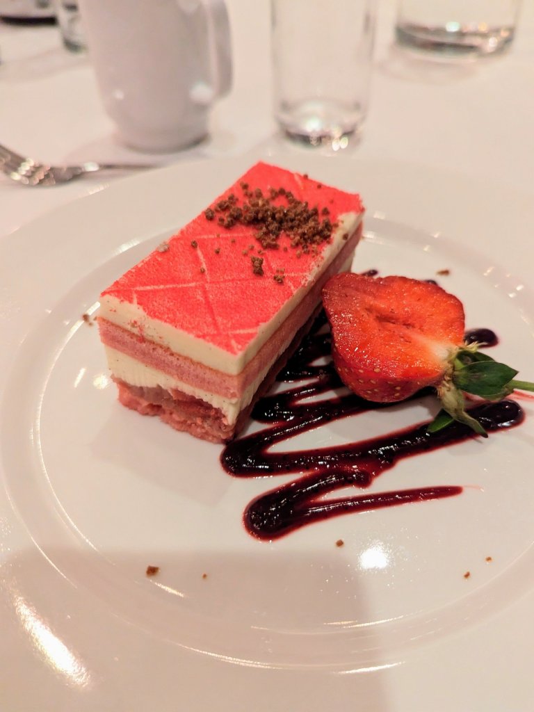 After a day of 20k steps, dinner at the hotel was well-received: a multi-course meal of multigrain bread, pesto tomato salad, couscous and falafel, and a strawberry layered dessert. Once again, Jessica’s mood improved considerably, though she hadn’t noted any discouragement prior. Conversation with tablemates lasted well after dessert, and we went to bed with smiles on our faces.
