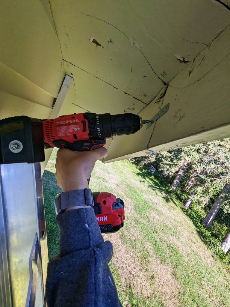 As with any project I’ve ever tackled, the deeper I go, the more work is found. Today I’ve decided to take the trim board dangling from the northwest eave and line it up with its neighbors. I went to the hardware store to fetch a mending brace (I looked for a bar with holes in it, and ACE labeled the bar thus) and positioned the ladder below the offending dangler. I ascended the ladder, armed with a drill, screws, the mending brace, and blithe but ill-founded confidence. The eave was 2″ closer to the wall than the combined length of the drill and screw, so I was forced to remove my fingers from the grip of the drill, using my thumb on the trigger instead. This, combined with a 120⁰ torso twist from my precarious ladder perch and my lack of necessary hands (I needed at least three) led to a predictable fumbling of five screws in rapid succession to the grass below, each accompanied by a dagnabit. I was able to locate four of them (repeatedly, crawling up and down the ladder thrice), and finally the four screws were seated in the brace, the trim board oriented somewhat in the intended plane.