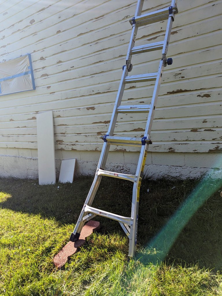 FOUR DAYS LATER, I’m still scraping paint. But I’ve mastered the non-OSHA compliant setup of a ladder straddling a stump, with a landscaping brick under one leg to make the ground level, Jessica standing with one foot on a rung and plastering her other foot against the wall in order to reach the eave overhead. 7mph breezes are very gentle, except when you’re trying to wrangle masking plastic and a roll of tape from atop a ladder. I’ve had a lot of arguments with the wind – and I’ve lost every one of them.
