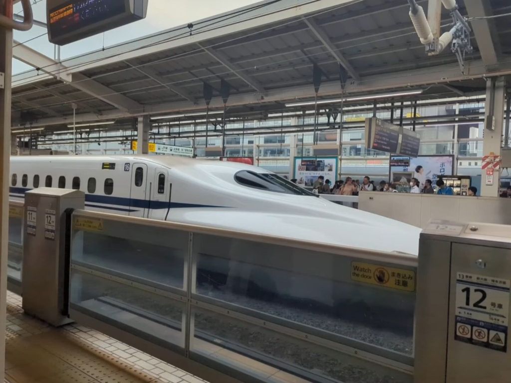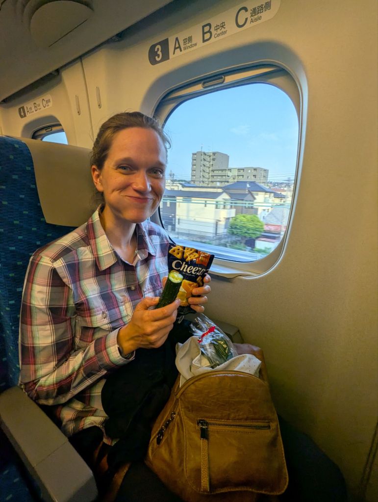 The WHOOOOOSH of the Shinkansen screaming through the station was enough to make my hair stand on end. Sixteen cars flew by faster than I could take a bite of my 7-Eleven cucumber (which, by the way, was my favorite snack of the entire trip 🥒). We found our seats and settled in for an ear-popping, eye-widening journey to Kyoto at nearly 200 mph.