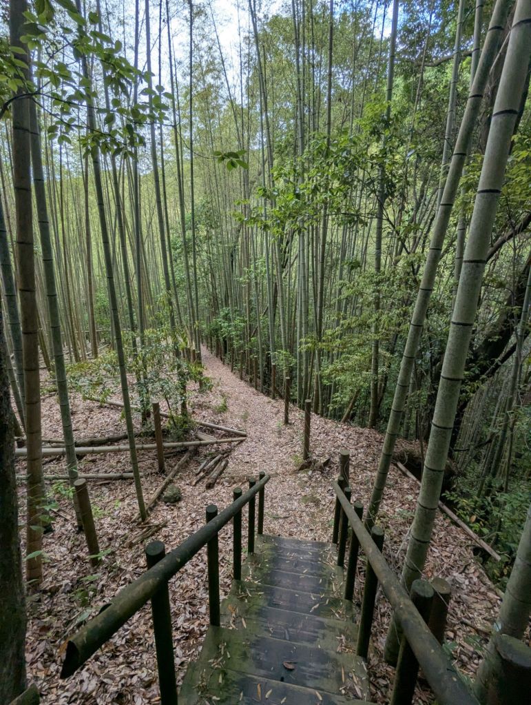 On a nature high and with 3 hours before our next appointment, I convinced Nancy to follow me into an unmapped forest trail just beyond the Moss Temple. A quiet stream, majestic stands of bamboo, and mossy log-lined steps into hardwood forest beckoned me further up and further in… but prudence turned me around as I recognized walking deeper in the forest would make me late.