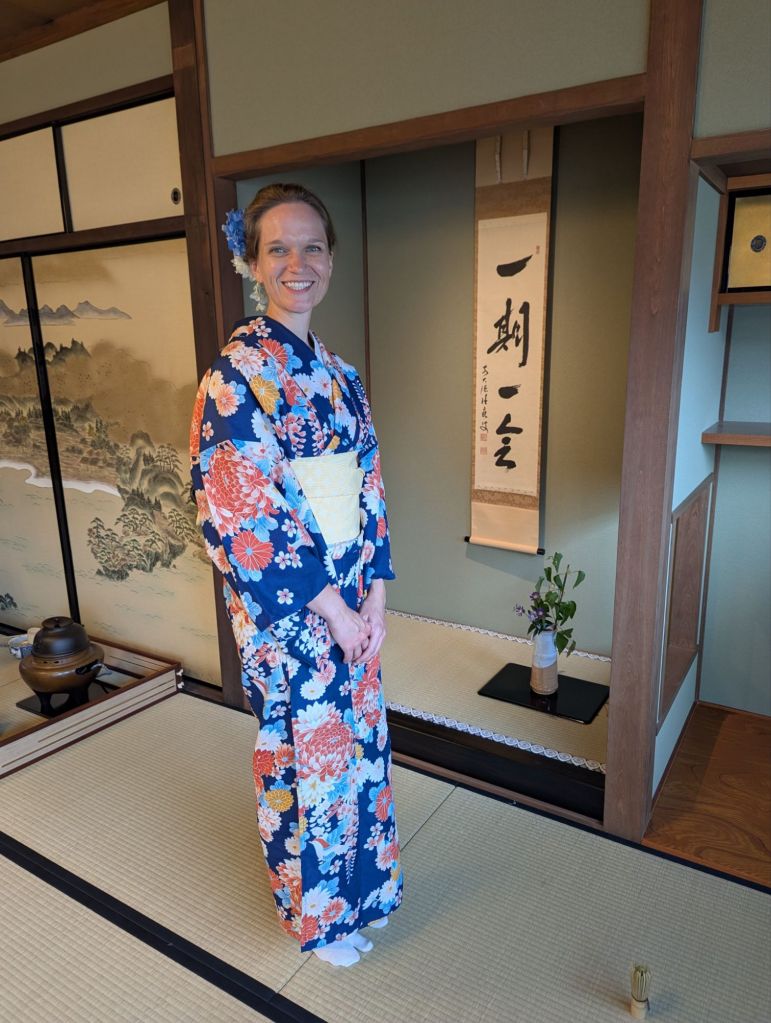 At the tea house, we were ushered into a women’s dressing room where we were given a garment bag and instructions to change. I was surprised to be given a very light white garment, feeling sheepish as I came out of my dressing booth and feeling immodest in the thin material. I was relieved to be guided to a rack of kimonos and asked to choose one to wear over my white undergarment. Phew.