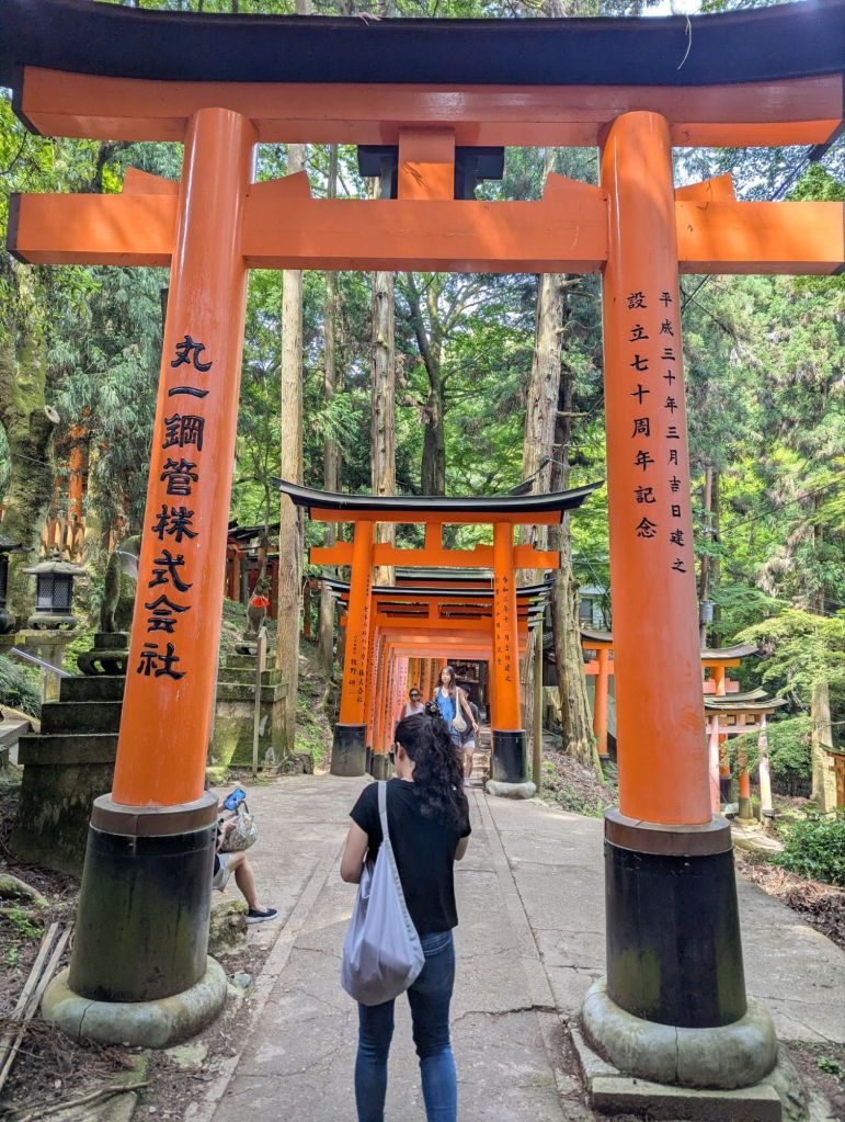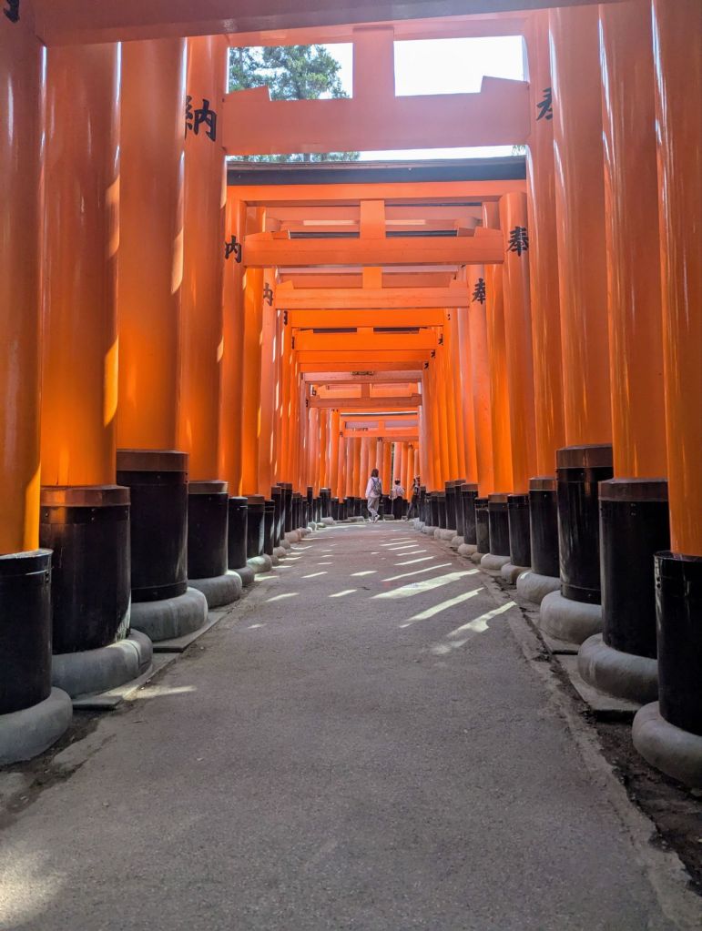 Our third and final day in Kyoto started early in an attempt to beat the crowds. We stashed our luggage at Kyoto Station – a much more welcoming stop before rush hour – and carried on to Fushimi Inari, a collection of mountain shrines famous for its numerous vermilion torii gates. We climbed Mt. Inari with a few thousand other tourists, enjoying a forest path lined by huge gates and bathed in birdsong and komorebi (dappled sunlight).