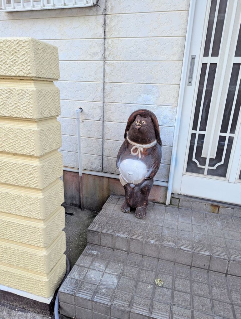 I woke up before the sun β remarkable when dawn breaks at 4:30am β and listened from the patio to the raucous dawnsong of birds ready to greet the day. Their exuberance drew me outside to chase the sunrise, strolling down the quiet side streets of a sleeping seaside town. I wandered alongside fishing and touring vessels, a shipping harbor, and multiple statues of the strange but endearing tanuki (raccoon dog). I clambered over a waterbreak and down the steps to the river at low tide, marveling at the green algae growing on every wet surface. It beckoned me to take a closer look… by removing all friction from beneath my feet and pulling me suddenly to the rocky floor, tailbone first. What a way to wake up!