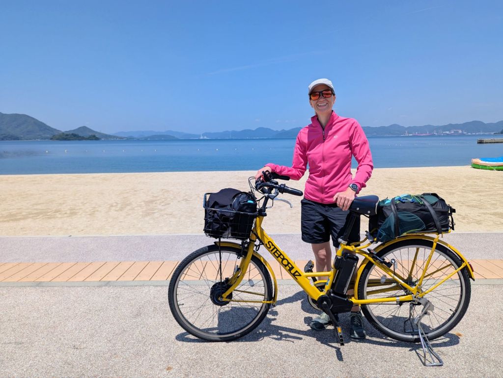 Nancy and I got our rental bikes (upgraded to e-bikes: best decision) and strapped our bags down before heading to the ferry across the river. We were riding by noon, following the 3-inch blue line tracing the 70+ kilometer bike trail over six islands and seven bridges. Ikuchi Island, the third of our island stops, was our home for the first night. We each experienced exuberant delight at this first evening bike stay at Bonapool Rakuseien: Nancy was enamored by the hostel design, and I by the cucumber, baguette and cheese I found at the local grocery store.