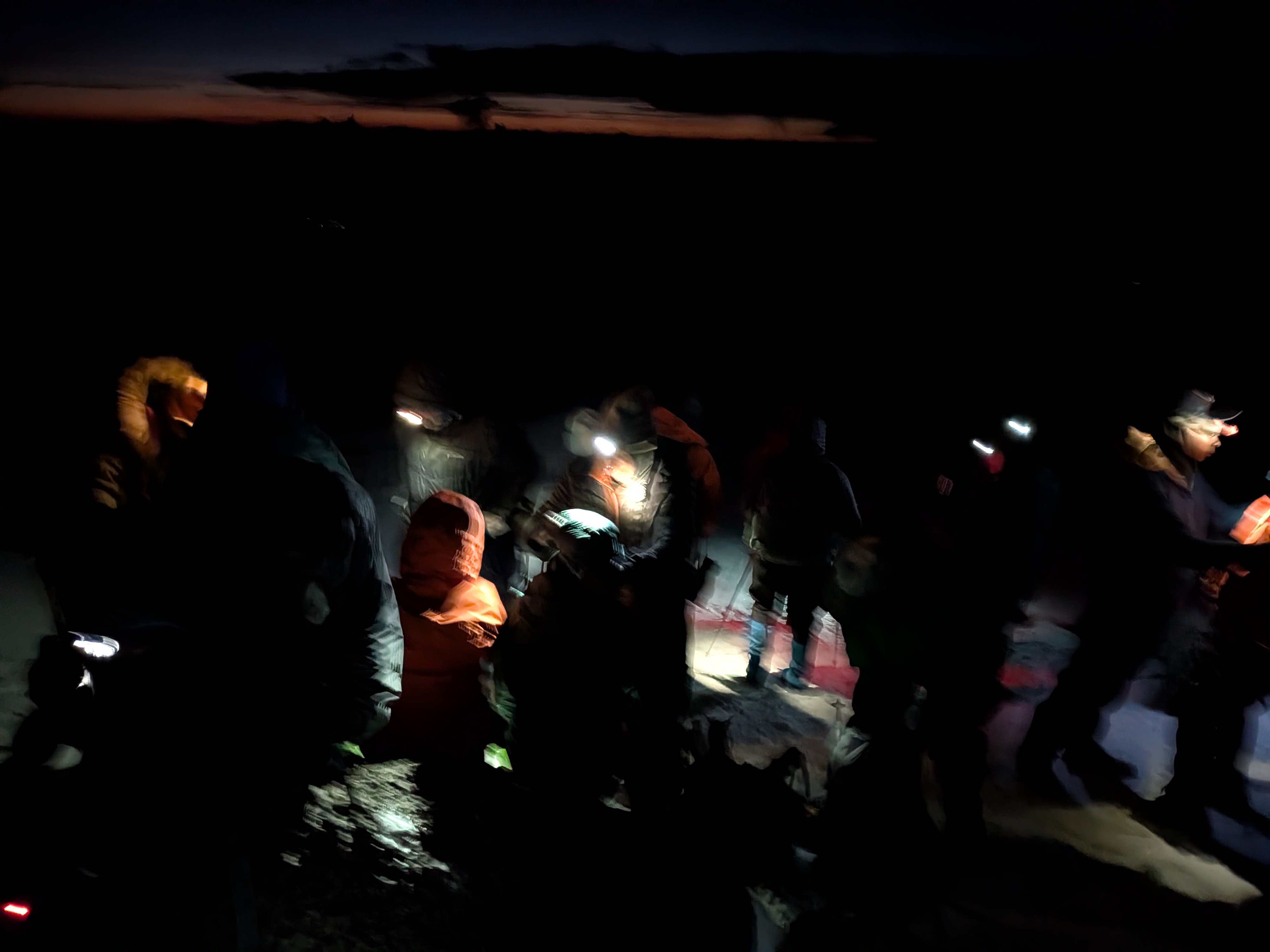 We were 6.5 hours into our hike – cold, dark, trudging drudgery. The sintered snow on slippery scree forced us to place each footstep carefully, some steps sliding back down the slope and stealing precious energy. The air grew thinner – we were nearing 19,000 feet, where atmospheric pressure is so low that each breath discharges only half of the oxygen picked up at sea level. Our slow trudge up the scree slope matched the cadence of a funeral march, our “pole pole” (POH-lay POH-lay) footsteps falling once each second, punctuated by pursed-lip breathing, sniffles, and coughs.